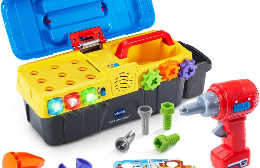 Fix and play with the Drill and Learn Toolbox by VTech; open this toddler-friendly toolbox and get ready for role-play fun with the included electronic fix-it tray, working toy drill, hammer, wrench, nails and screws